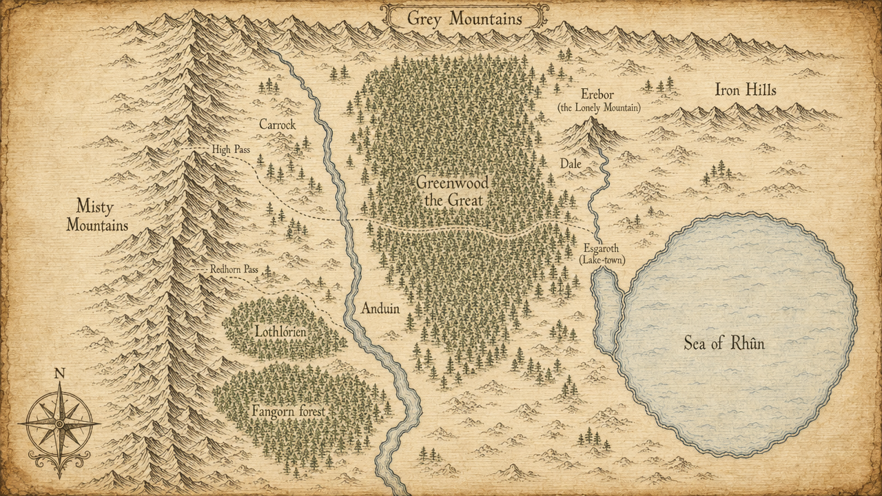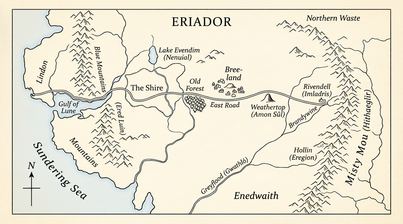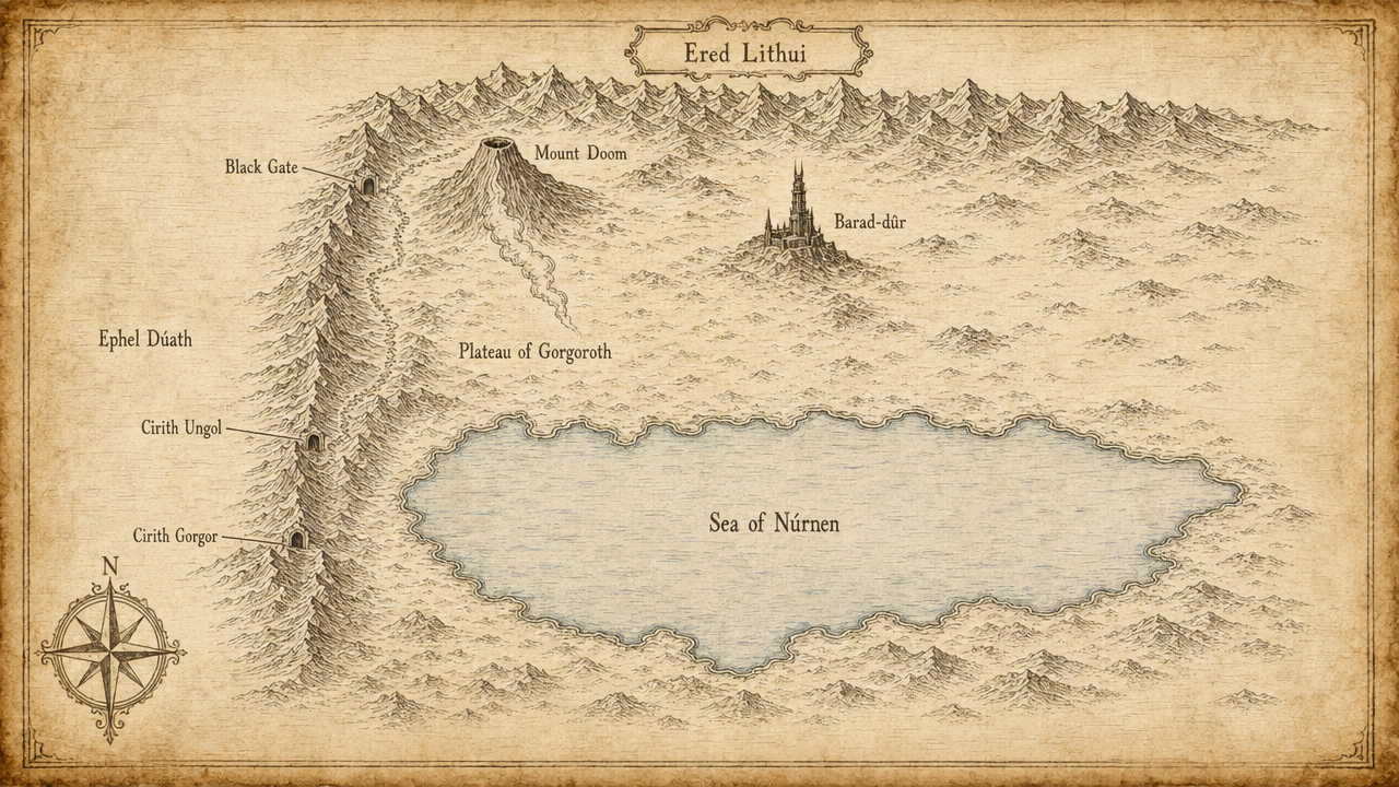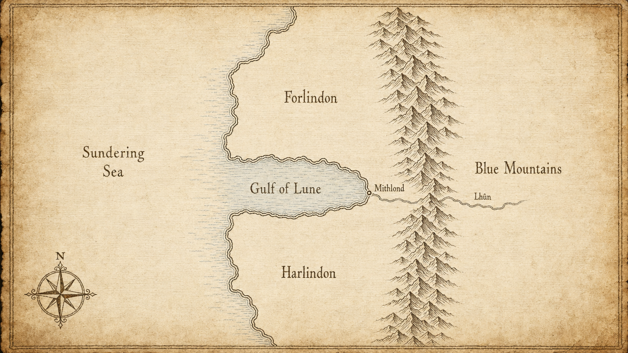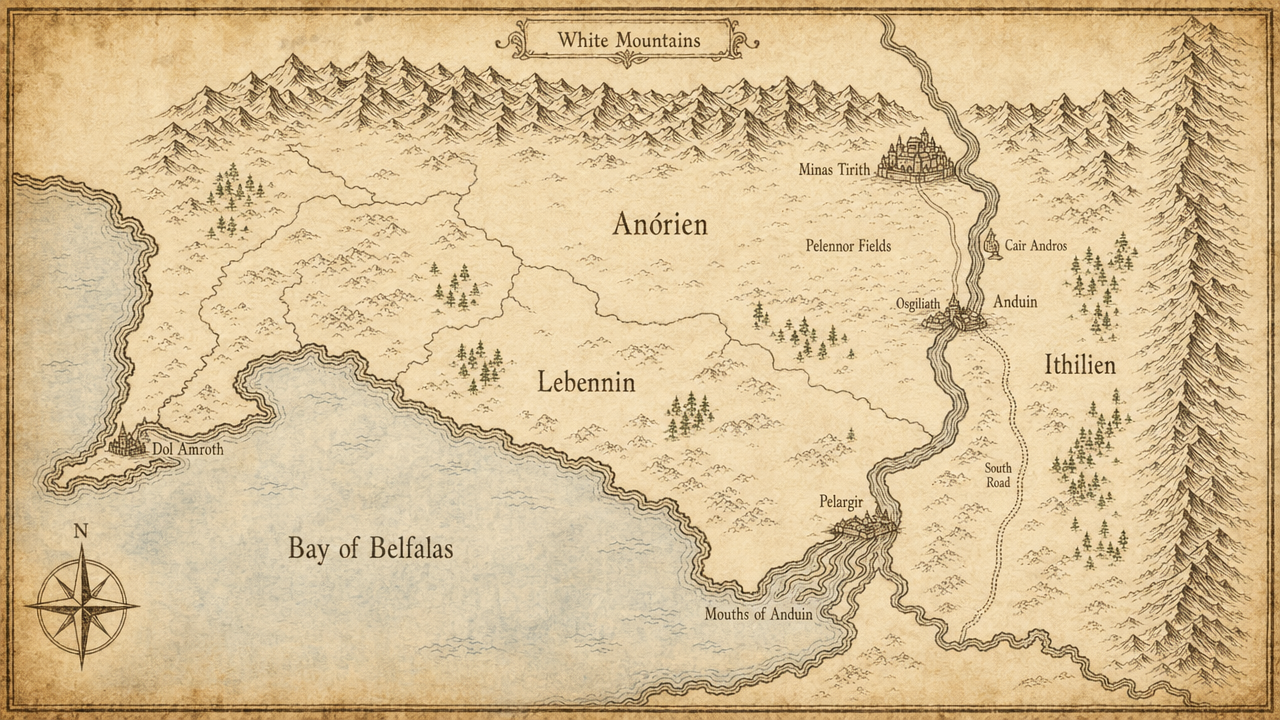 The Valar raised Númenor out of the sea after the War of Wrath as a gift to the Edain who had stood with the Eldar against Morgoth, a five-pointed star at the centre of the sea, the Meneltarma rising at its midpoint. For three thousand years the Dúnedain were the glory of mortals: long-lived sea-kings whose ships ranged from Lindon to the southern coasts. In Middle-earth, in Eregion, the Eldar smith Celebrimbor forged the Three Rings; Sauron under a fair name forged the Seven and the Nine; and in the fire of Orodruin he forged the One in secret, that he might rule them all.